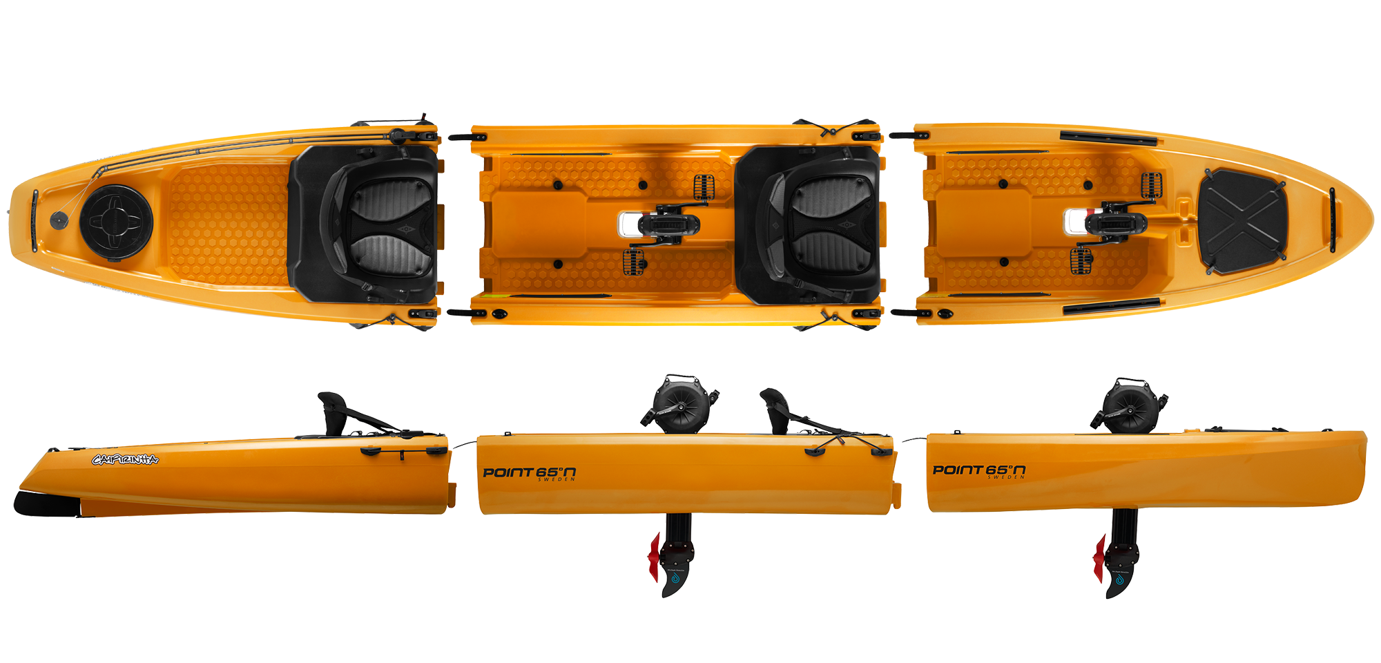 The Caipirinha, designed by Magnus de Brito, is a high-performance modular sit-on-top kayak built on the Mojito platform. It features raised seats, advanced rail systems, and an optional pedal drive for added versatility. With Point 65’s Snap-Tap™️ system, it easily converts from solo to tandem in seconds. Combining fun, functionality, and comfort, the Caipirinha ensures an enjoyable kayaking experience.