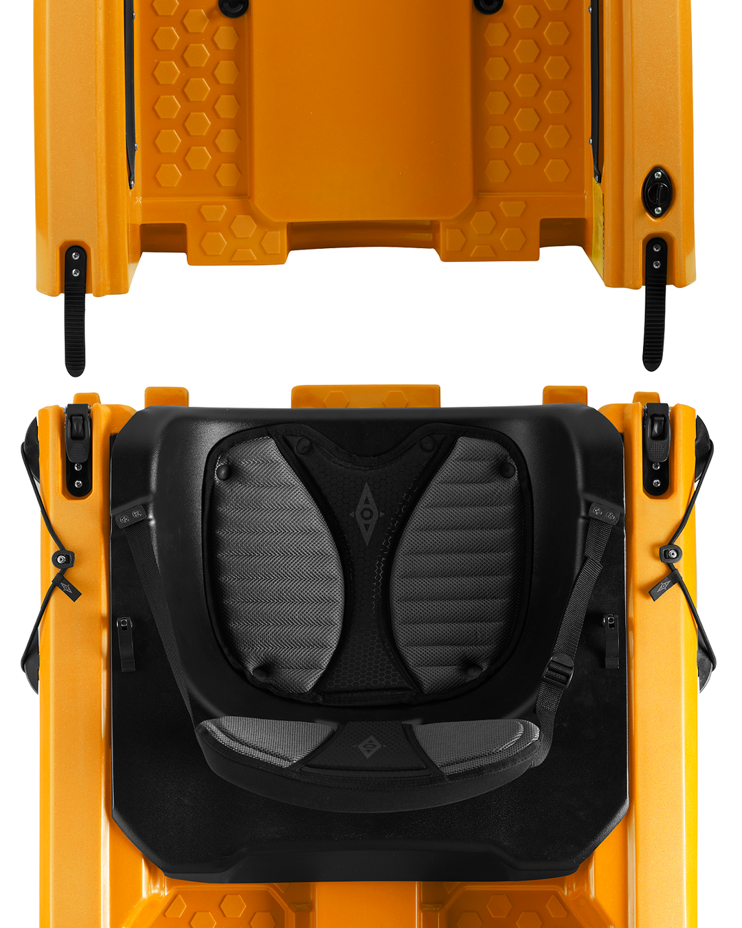 Settle into the cockpit with confidence. The rudder control is effortlessly managed with one hand, enhancing maneuverability. Each side of the cockpit features two large storage cubbies, providing ample space for essentials. For added comfort, the kayak boasts a raised seat equipped with a flip-up backrest, padded with quick-dry foam for sustained comfort during your journey.